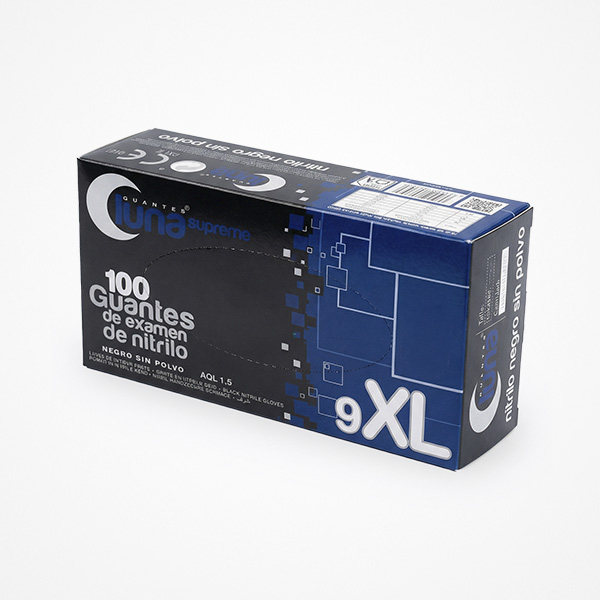 Guantes de nitrilo color negro, estuche de 100 Uds. No estéril, ambidiestro. La superficie interna está clorinada para facilitar el calzado sin necesidad de polvo. Exento de látex natural. De una mayor resistencia y espesor, mantiene la comodidad y dexteridad.  Tiene un nivel de calidad AQL 1.0. Cumple con las normativas europeas de aplicación: EN 374(1-2-4-5), EN 16523-1, EN 455 (1-2-3-4), EN 420 y EN 388.