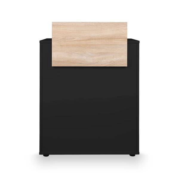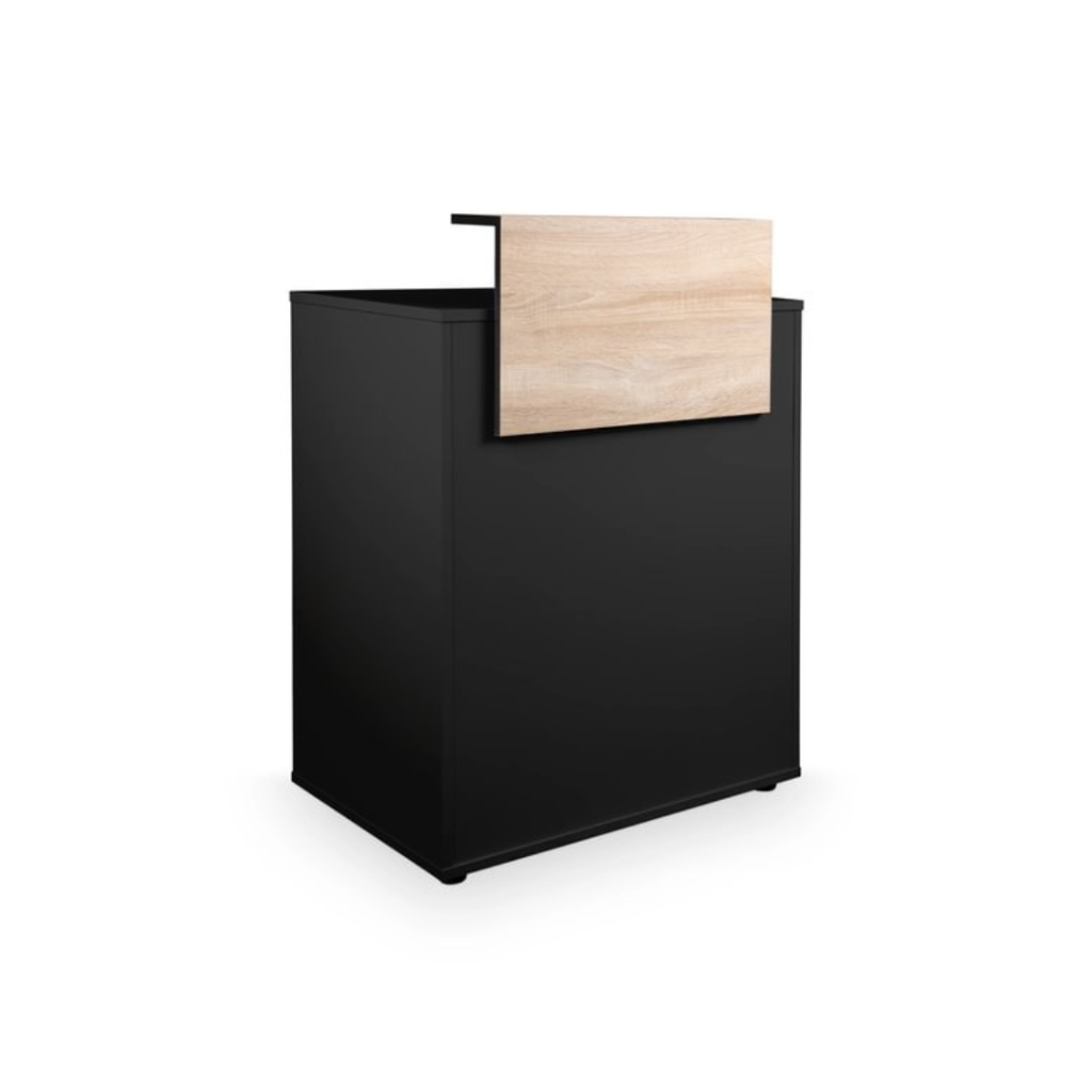 Fabricada en aglomerado de alta densidad, recubierto con melamina negra a doble cara y cantos de PVC redondeados para mayor resistencia y durabilidad.