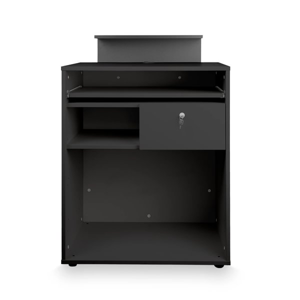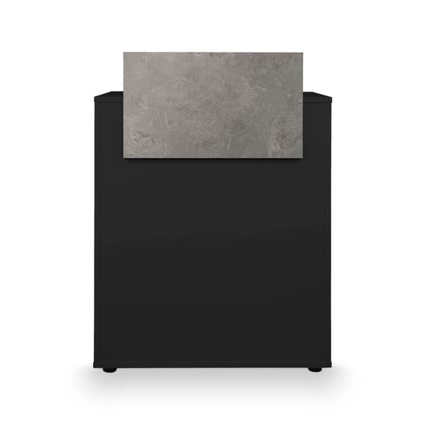 Fabricada en aglomerado de alta densidad, recubierto con melamina negra a doble cara y cantos de PVC redondeados para mayor resistencia y durabilidad.