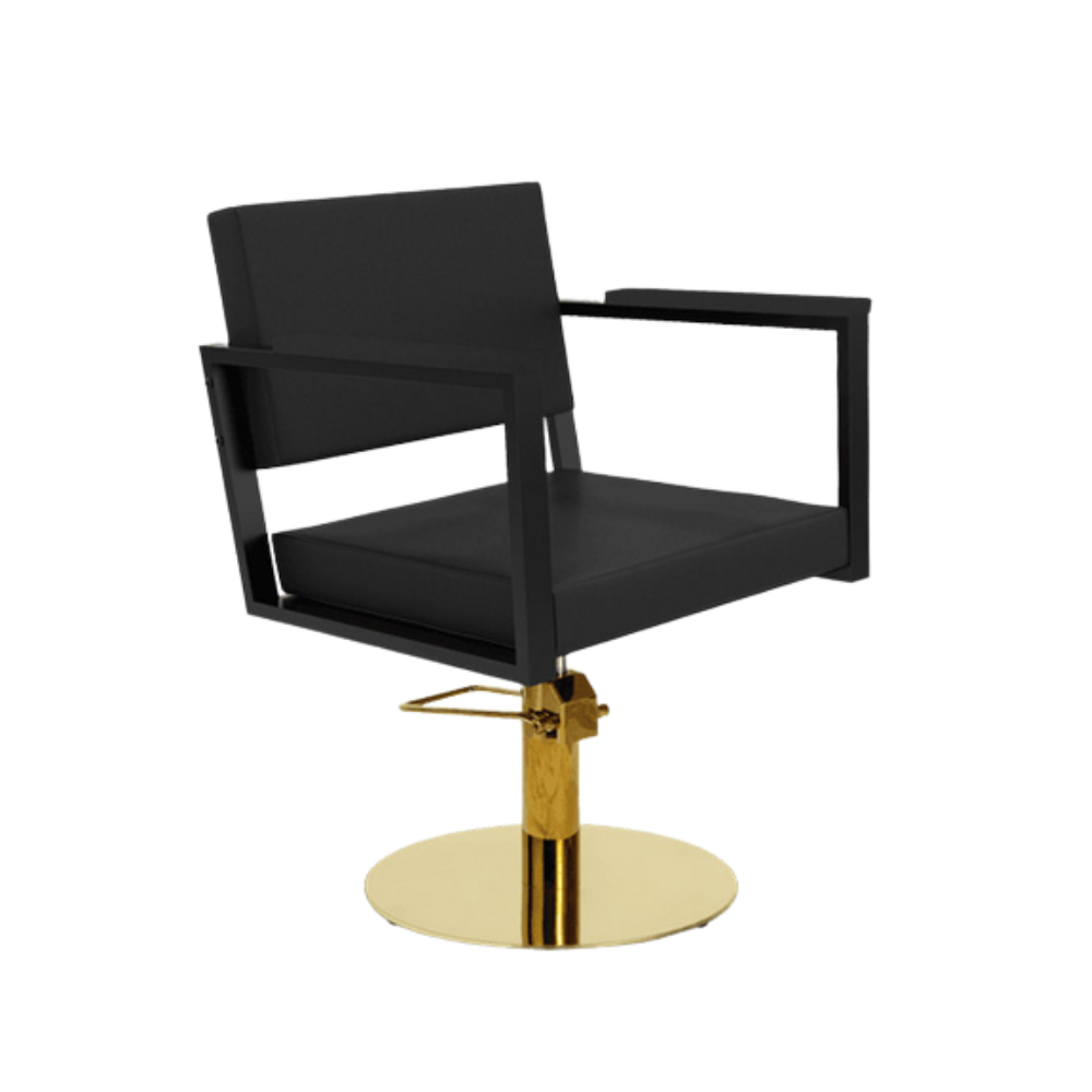 Silla de corte modelo OCEAN El sillón de peluquería destaca por sus líneas elegantes y estructura metálica pintada en negro.. Está disponible con diferentes opciones de base.