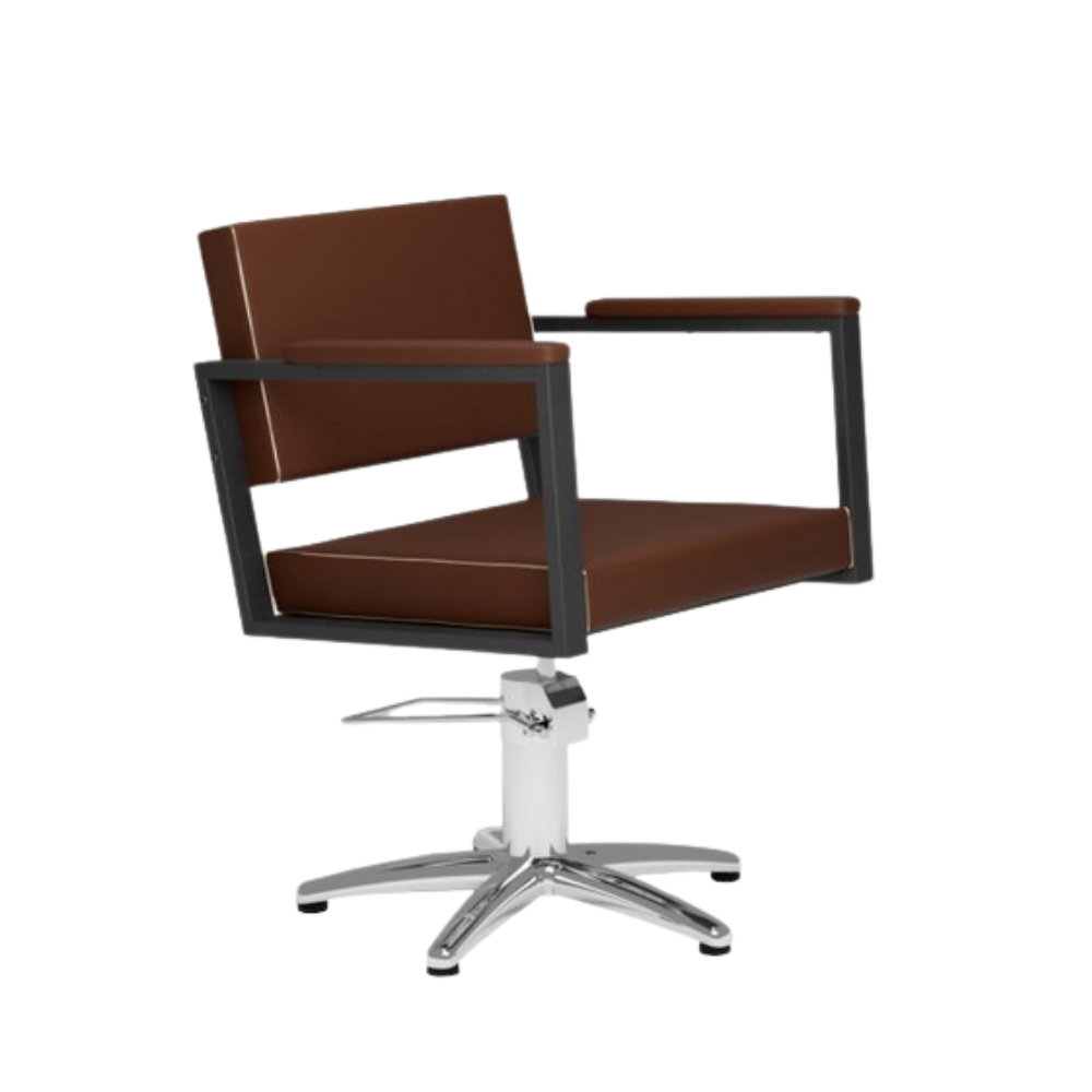 Silla de corte modelo OCEAN BR El sillón de peluquería destaca por sus líneas elegantes y estructura metálica pintada en negro.. Está disponible con diferentes opciones de base.