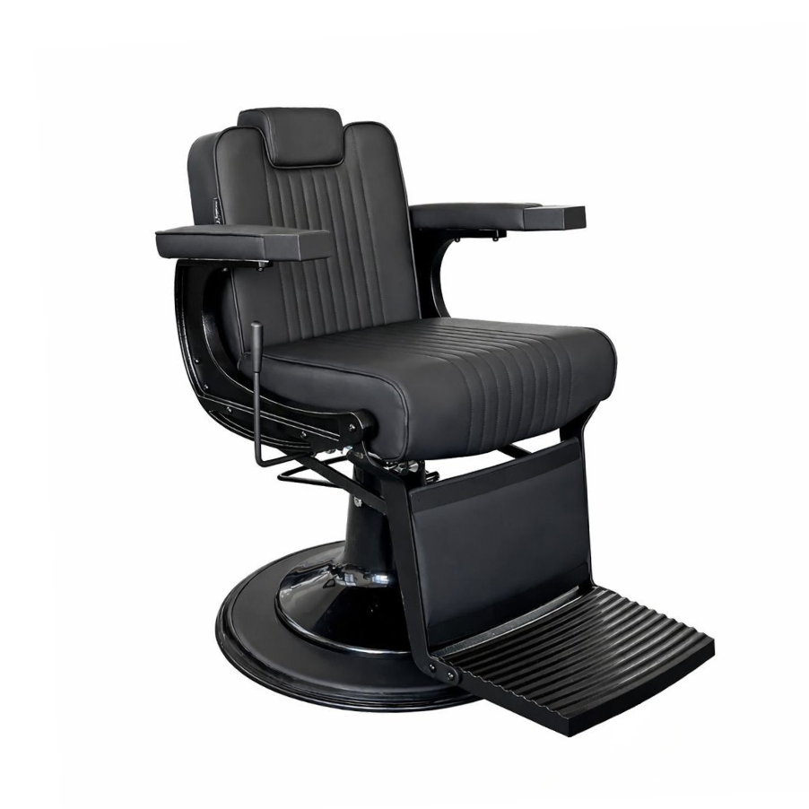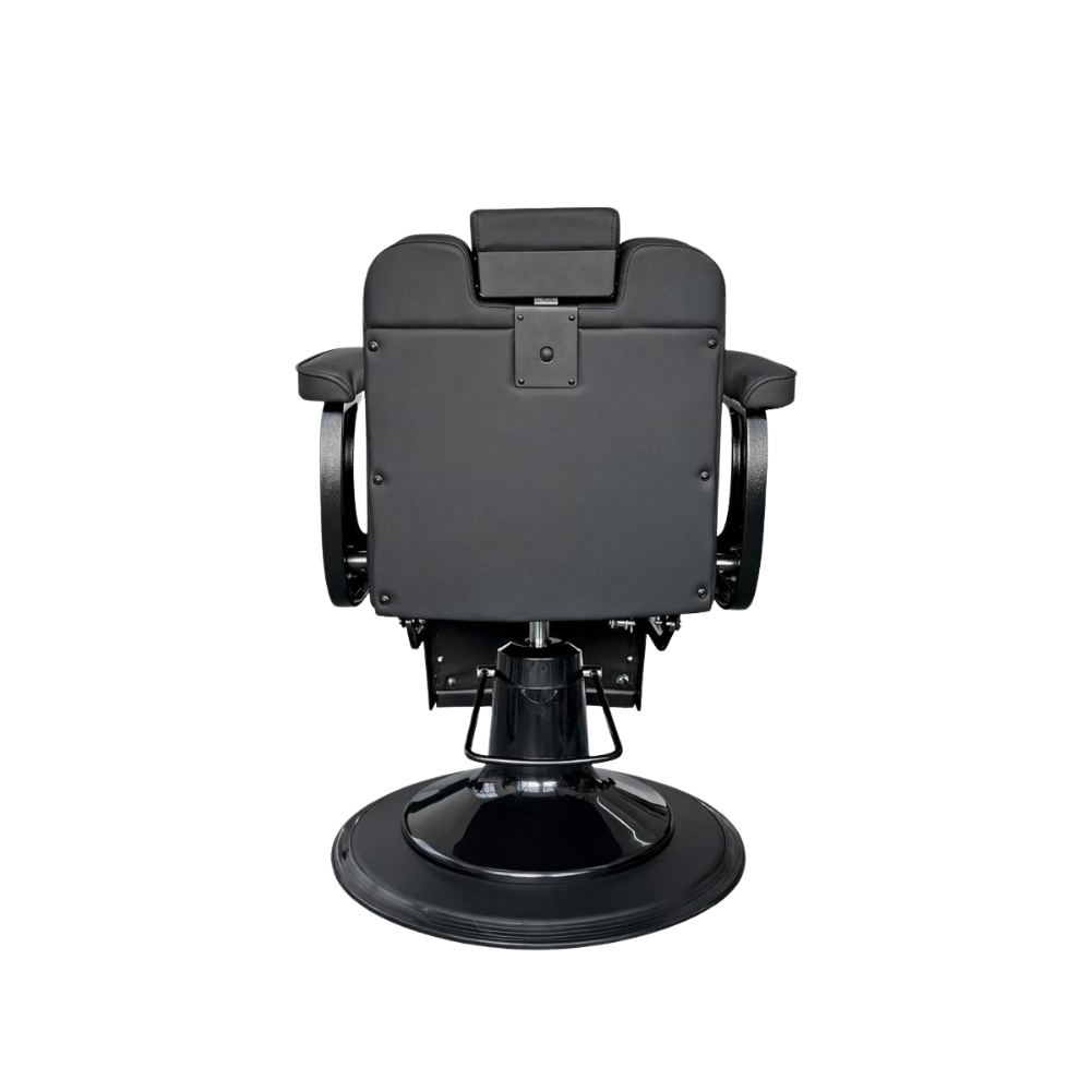 Sillón de barbería ELYON BLACK. Estructura en aluminio fundido pintado en Negro Mate. Tapizado en poli-piel de alta calidad retardante al fuego en color Negro Mate. Costuras en martindale 100.000 ciclos. Interior con estructuras de madera y Alumino fundido, espuma de alta densidad de recuperación rápida. Bomba hidráulica ajustable en altura con bloqueo de freno. Reposacabezas regulable en altura integrado en el respaldo que facilita el trabajo del barbero.