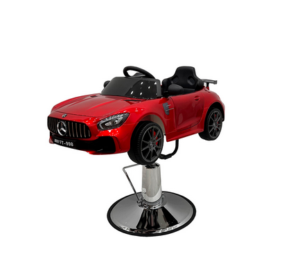 Silla de corte infantil con diseño atractivo tipo deportivo, totalmente funcional con luces, sonido y cinturón para una experiencia divertida durante el corte de cabello. Equipado con mecanismo giratorio de 360º y altura regulable con sistema hidráulico.